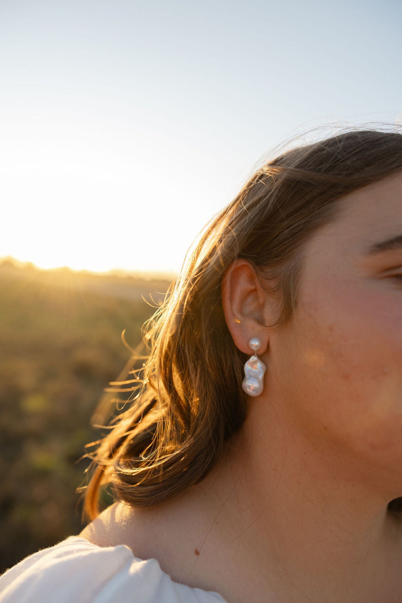 The Audrey earrings showcase radiant, handcrafted Baroque pearls that embody elegance. These earrings are an ideal choice to complement your attire for any memorable occasion. Please note that the size of pearls may vary slightly from those shown in the images.